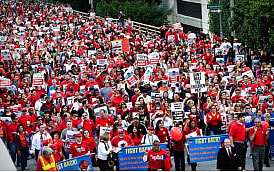 (写真)アチーブメントテストのボイコット闘争、1月29日の大デモと、スト権確立のための投票(3月20日~25日)の実施の発表などのあいつぐ闘いによって、ロサンゼルス統一教組(UTLA)とロサンゼルス統一学区(UTLSD)内の他の7つの組合に属する教育労働者は、2300人の教師の解雇撤回を勝ち取った。