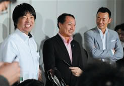 (写真)会談後、都内で記者会見する大阪府知事・橋下、杉並区長・山田、横浜市長・中田の極悪首長3人組(8 日)
