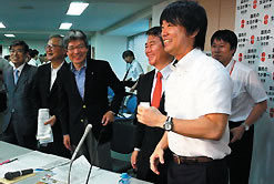 (写真)橋下は、民主党本部で、民主党「次の内閣」総務相の原口一博らとも会談。代表の鳩山由紀夫も「橋下知事は非常に民主党の考え方に近い。これからも連携を取り合っていきたい」と秋波を送った(8 日)