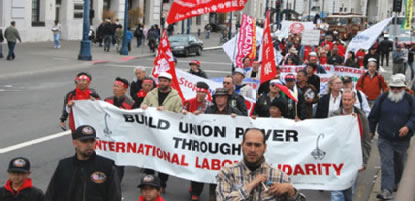 動労千葉訪米団がサンフランシスコをデモ行進! 米国ILWU(国際港湾倉庫労組)の呼びかけに応えて「サンフランシスコ・ゼネスト75周年行進」に参加して、世界の闘う労働者・労働組合と共にサンフランシスコの港をデモする動労千葉訪米団(2009年7月9日)