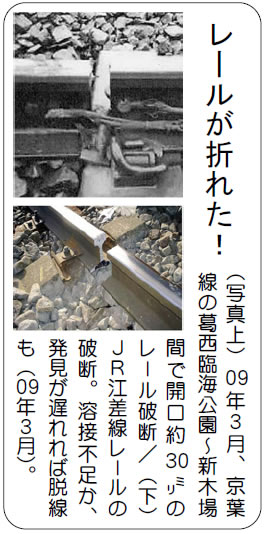 レールが折れた! (写真上)09年3月、京葉線の葛西臨海公園~新木場間で開口約30㍉のレール破断/(下)JR江差線レールの破断。溶接不足か、発見が遅れれば脱線も(09年3月)。