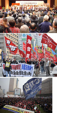 (写真 上:米韓独労働者など450 名が参加した11・6 国際連帯集会(千葉)/中:11・7 銀座デモ/下:11・7 ソウル4 万人集会)
