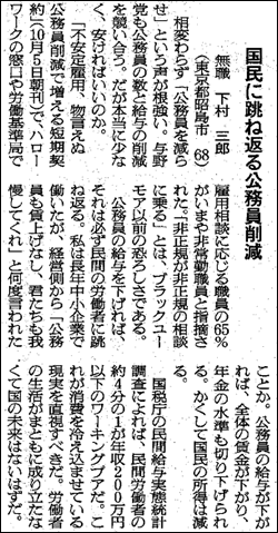 公務員の数と給与の削減は必ず民間に跳ね返る。労働者の生活がまともに成り立たなくて未来はないと訴える中小企業に勤務していた労働者の声11/1『朝日』