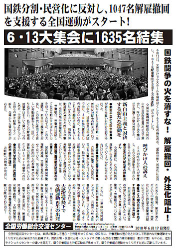 国鉄1047名解雇撤回! 労働者派遣法撤廃! 改憲阻止・麻生内閣打倒! 6月14--15日連続集会・デモへ結集しよう