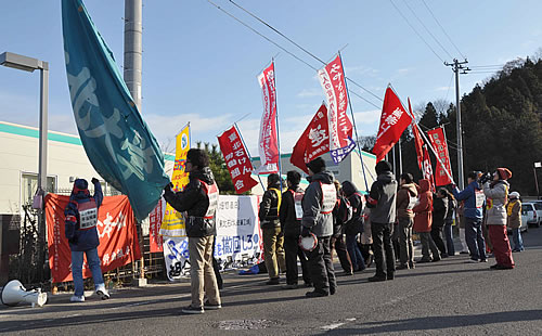 労組は地域の仲間とともに解雇撤回を求め、09年冒頭から3波のストライキを打ち抜きました。そして2月末の解雇攻撃に対し、新工場門前での就労要求闘争と地労委闘争を開始しました。組合員はアルバイトをして生計を立て、時には悩み、衝突しながら、徹底討論・徹底一致で5年にわたる解雇撤回闘争を貫いてきました。2010年7月にみやぎ連帯ユニオンに加入し、アルバイト先でも組織化・分会作りに挑戦し、誇るべき拠点分会として闘ってきました。地労委命令の破綻点