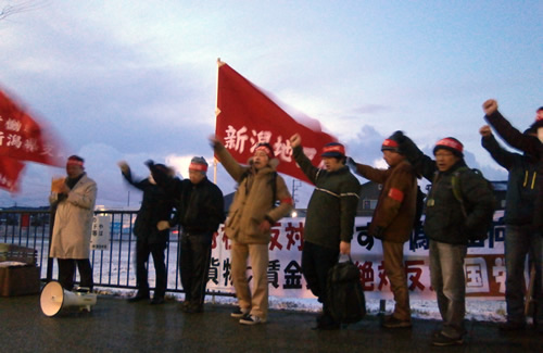 3月10日17時、「分社化反対! 許すな偽装出向! 貨物の賃金抑制絶対反対!」の横断幕が新津駅西口広場に掲出され、国労地本、支部、新潟駅、東新潟機関区などの組合旗が寒風に翻りました。赤旗が囲む中で、車両製作所分社化反対と貨物の賃金抑制反対の駅頭宣伝が支部役員のマイクで始まりました。製作所から帰ってくる労働者にビラも配布されました。仕事上がりの組合員・支援が次々と詰めかけて西口広場の半分を埋め尽くすなか、総決起集会です。地本副委員長の主催者挨拶、支部書記長の経過と方針提起、貨物協議会の賃上げ闘争報告、参加した自治労・教組など多くの支援労組が紹介され、新津地区平和環境労組会議から共に闘う発言を受けました。組合書記は「予定の2倍の参加ですね」と驚きと感激の口調でした。いよいよデモ発進。新津駅から車両製作所に向けて、組合員と青年労働者を引き付けた怒りと団結の行動です。国労組合員30人(新潟地域組合員の4割超)を中心に、地域の仲間約60人、三桁に近いデモは、JRの独身寮や社宅の脇を行進して「鉄道の町・新津」を揺るがしました。「車両製作所の子会社化反対」「新津にJRの製作所を残そう」「外注化反対」「全ての労働者の大幅賃上げを勝ち取ろう」「秘密保護法反対」「原発再稼働反対」「3・11福島原発事故を忘れないぞ」。響き渡るコールは参加者の団結を強化しました。40分余のデモ行進は、終始シュプレヒコールを発して製作所と地域の仲間に訴え、終着点の製作所正門前では、期せずして製作所内から拍手と歓声が湧きました。