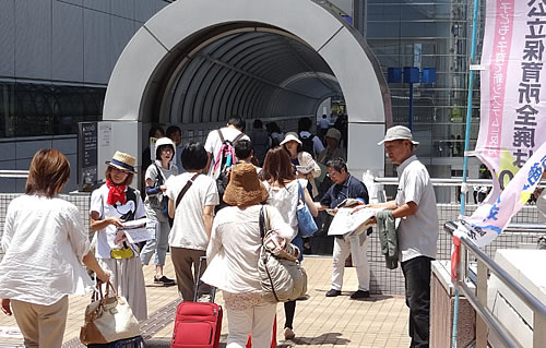 保育集会当日は猛暑の中、大宮ソニックシティ前に、全国労組交流センターの保育労働者や自治体の仲間、全国女性部など27人が結集しました。全国から続々と集まってくる保育関係者に対して、「新制度は子どもの命を奪い、労働組合を破壊する」「命よりもカネもうけの保育は絶対反対」「団結して闘えば勝てる」と、熱い思いでビラまきを行いました。