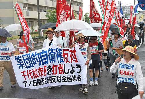 7月6日、泉州住民の会と関西労組交流センターの主催で、泉佐野市内で地元住民はじめ155人が参加し関西新空港反対全国集会を開催しました。5月泉佐野市議選に勝利した自信と路線に対する確信に満ちた集会であり、安倍内閣が閣議決定した集団的自衛権行使容認反対の集会