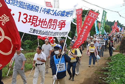 7月13日、成田市天神峰で、三里塚芝山連合空港反対同盟主催による「第3滑走路粉砕」を掲げた集会とデモが行われた。花植木センター前の市東孝雄さんの畑を会場に、全国から185人の労働者・農民・学生・市民が結集した。空港周辺地域の住民と結びつく画期的なデモ行進