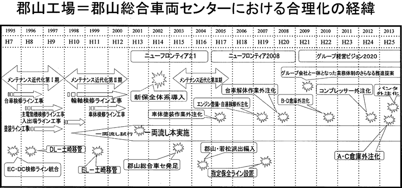 郡山工場においては、国鉄時代から外注化が行われてきていますが、2001年に始まったNF21以降のJRの外注化施策は、NF21以前のような要員不足を補うための、3K職場をなくすための施策としてではなく、また、車両検修の付帯業務に限った外注化としてではなく、コスト削減のため、車体や台車の解体組立という基幹業務にまで範囲を広げた、全面外注化として進められています。