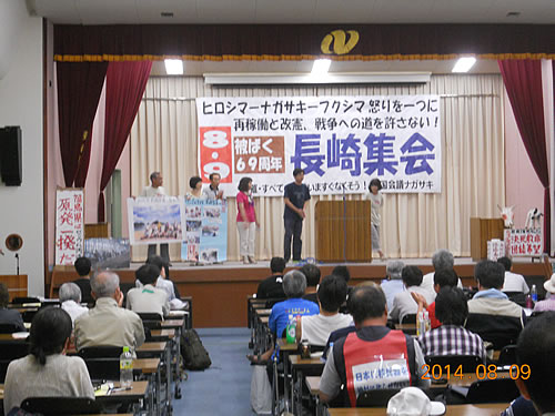 午後の集会は長崎県勤労福祉会館で行われました。吉沢さんは、3・11当日の状況から福島第一原発の爆発を克明に話され、現在のフクシマを怒り百倍で訴えられました。「自分は牛飼いです。だから牛を見放さない」と、牛と共に生き抜く決意が述べられました。