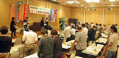 婦民全国協相模原支部からカンパアピールが行われ、田中委員長のアピールで会場全体の集中度が高まる中、闘いの報告と決意表明に入りました。組合権力戦を闘う三浦半島教組の仲間を先頭に、動労千葉を支援する会として横浜自治体と横浜全逓の労働者から、また病院労組、湘北合同労組、合同労組かながわから、そして反原発・保養に取り組んでいる仲間が登壇し、10万筆署名を軸としながら職場・地域での闘いが前進していることが報告がされました。