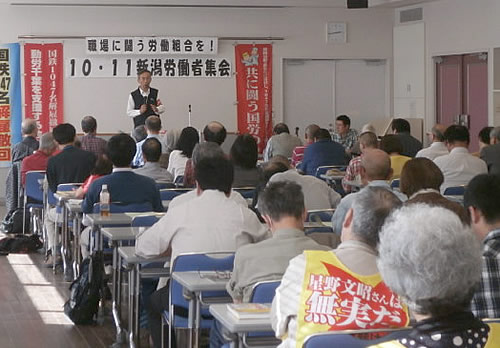 10月11日、新潟市内で「不当労働行為を許すな!国鉄1047名解雇撤回!民営化と戦争にひた走る安倍を倒そう!職場に闘う労働組合を!」というスローガンで新潟労働者集会を開催し、65人の結集で成功させた。
