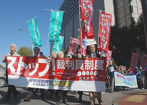 11月14日昼、「裁判員制度はいらない!大運動」が主催して、東京で裁判員制度の廃止をめざすデモが行われた。150人が参加し、都心の官庁街―オフィス街を力強くデモした。毎年11月のデモは、最高裁が次年度の裁判員候補者に選んだ人びとに名簿記載通知を送る時期に合わ