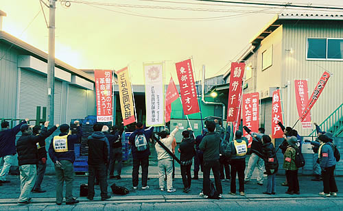 しかし、山下ゴムは12月25日の団体交渉について、回答期限であった12月22日に何と「拒否」と言ってきました。100%子会社である我々吉崎製作所の雇用責任の追及、会社解散の撤回をさせるべく、山下ゴムとの団体交渉を要求していたのですが、見事に蹴ってきたのです。「こうなったら山下ゴムに乗り込んで社前抗議行動だ!」と組合員は意気揚々としています。