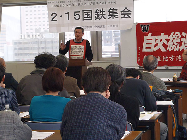 2月15日、今年も北海道で国鉄集会を開催することができました。JR北海道の安全崩壊が社会に衝撃を与え、大きな関心を集めた昨年に引き続いて、「戦争と生活破壊に立ち向かう2・15国鉄集会」と題して34人の参加(うち17人が初参加)で行われました。道内の元闘争団員の方や、新たな労働組合からの組織的な参加もありました。