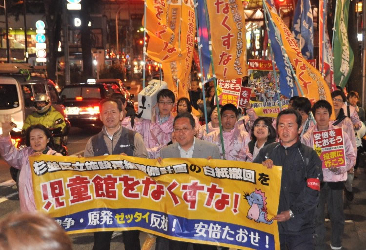杉並区議会議員選挙の告示を翌日に控えた4月18目、東京西部ユニオンとNAZEN杉並の呼びかけで、「児童館をなくすなリ「戦争・原発ゼッタイ反対! 安倍たおせリのデモが杉並区・阿佐ヶ谷の街に登場した。東京西部ユニオン副委員
