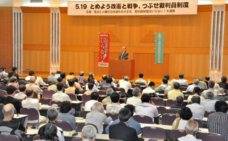 5月19日夜、東京・霞が関の弁護士会館講堂クレオで「とめよう改憲と戦争、つぶせ裁判員制度」集会が360人の参加で開かれた。主催・協賛は「憲法と人権の日弁連をめざす会」など4団体。弁護士と労働者・学生・市民が団結し、安倍打倒、安保法制成立阻止、新捜査手法・裁判員制度粉砕へ、決意を新たにする集会としてかちとられた。