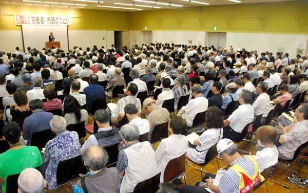 猛暑の続く8月15日の東京。錦糸町のすみだ産業館に向かう「戦争法案成立阻止!安倍70年談話粉砕!8・15労働者市民のつどい」参加者の胸には、みな一様に勝利の歓喜が刻み込まれていました。前日に閣議決定された「戦後70年談話」に心の底から怒るとともに、安倍政権が追い込まれている崖っぷちの危機をその談話に見ていたからです。