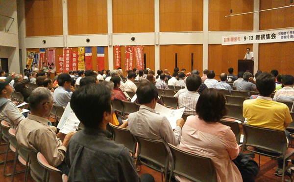 9月13日、京都府舞鶴市総合文化会館で、地元自治体労働組合が呼びかける高浜原発再稼働阻止の集会に200人が結集した。高浜原発から11㌔の舞鶴市で、労働組合が中心となって開催した画期的な集会だ。福島からの発言や、愛媛県職労、動労水戸、動労西日本からも発言が行われた。地元舞鶴市民も多く参加した。集会後、東舞鶴駅までデモ行進。