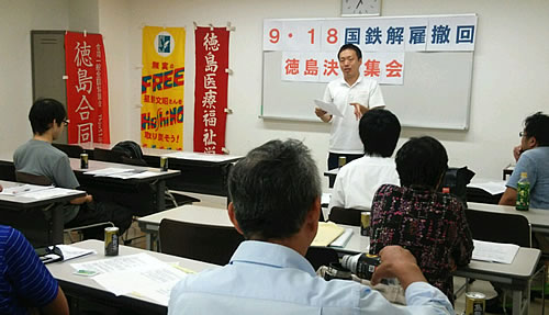 9月18日、徳島トモニプラザで「国鉄解雇撤回!徳島国鉄集会」を開催しました。この日は、まさに「戦争法案」反対の国会決戦中であり、ちょうど、徳島医療福祉労組の労働委員会闘争も重なっていました。