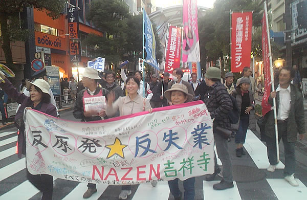 続いて数十万の戦争法反対の怒りを組織するため、連日駅頭街宣を行い10月17日にNAZEN吉祥寺で「ABE倒せ!」のデモを30人で勝ち取った。同日夜には「闘うUNIONを!」と被曝労働拒否を闘う動労水戸を招いて労働者集会を32人で成功させた。