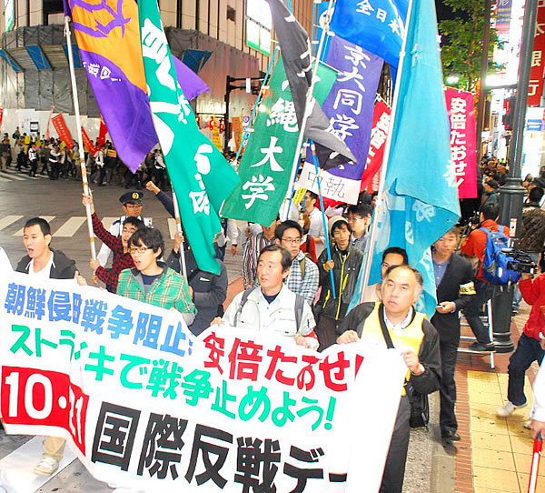 10月21日、全学連と全国労組交流センターの呼びかける10・21国際反戦デーの一日行動が都内で行われた。逮捕・勾留されていた全学連の4学生を19~20日に全員不起訴で奪還し、その喜びと勝利感があふれる中で10・21闘争は大成功した。代々木公園ケヤキ並木の集会には、首都圏を中心に250人の労働者・学生が結集した。