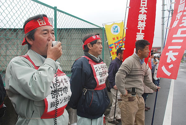 我々の職場も会社とSJKからの団結破壊と組合潰し攻撃の中で、鈴コン分会が職場の仲間のことを考え何をやるのかが問われている時でした。鈴コン分会は、職場で起こっていることは絶対に認めるわけにはいかないと仲間に話し、気持ちを一つにしていきました。10月17日、都労委の命令履行、賃上げ、会社都合休業の手当を上げろ、60歳定年撤回、65歳解雇撤回、組合への不当労働行為をやめろ、戦争法絶対反対という7項の要求を掲げ、私と鈴木(善)さんの2人で1日ストライキを行いました。門前に支援の仲間が多数駆けつけ、職場の仲間のほとんどが我々のストライキに手を振って応え、現場に向かっていきました。SJKの連中は全く精気がありませんでした。鈴コン分会の第2ステージ闘争への本格的突入です。職場の仲間が納得し支持する闘いを貫こう。職場支配権を奪い返します。