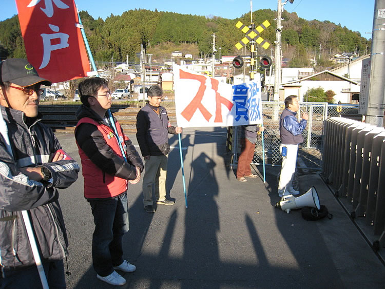 12月18日、動労水戸は青年運転士の會澤憲一組合員に対する「ライフサイクルの深度化」施策による駅への強制配転を阻止すべく第1波ストに決起した。午後3時に水郡線大子運輸科前に組合員が結集し、JR東日本水戸支社に対し、會澤組合員への駅強制配転の発令を断固として許さない意思を突きつけた。