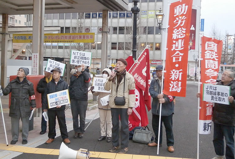 12月23日夕方、JR新潟支社前で、動労総連合・新潟、新潟地域一般労組、国鉄闘争全国運動・新潟が、羽越線事故10周年弾劾闘争に決起した。星野動労総連合・新潟委員長、杉野書記長らがマイクを握り、「JRは羽越線事故の責任取れ」「外注化や非正規職の使い捨てをやめろ」と訴え、怒りの声をJR新潟支社にたたきつけた。