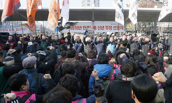 (写真 1月4日ソウル市内のチョンテイル烈士像の前で民主労総が「闘争宣布式」。1月8日までの国会で、労働法改悪案の上程を阻止した!)