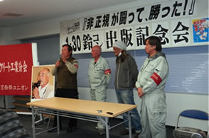 出版記念会は、マスコミも取材に訪れる中で開催され、さながら11月労働者集会の呼びかけ3労組(連帯労組関西地区生コン支部、全国金属機械港合同、動労千葉)を先頭とした春闘総決起実行委員会のようだった。大いに盛り上がり、何よりも鈴コン分会一人ひとりの晴れ晴れとした元気な姿と、佐藤副分会長に対する60歳定年制導入による解雇攻撃粉砕への大争議も辞さずに闘うとの決意表明に、集まった多くの仲間たちの新たなやる気と団結を力強く引き出すものとなった。