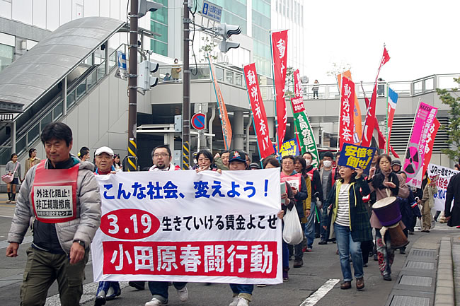 いよいよ小田原駅一周デモです。環境アクセス事務所前では職場の仲間に熱烈にアピールしました。「デモの声が良く聞こえた」と職場の仲間がエールを送ってきました。職場では、3・19集会とデモはものすごい注目でした。時廣組合員には「戻ってこいよ」と激励です。そして非正規の青年労働者が飛び入りでデモに参加しました。