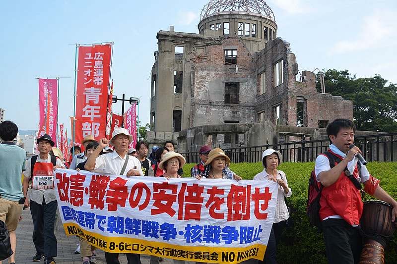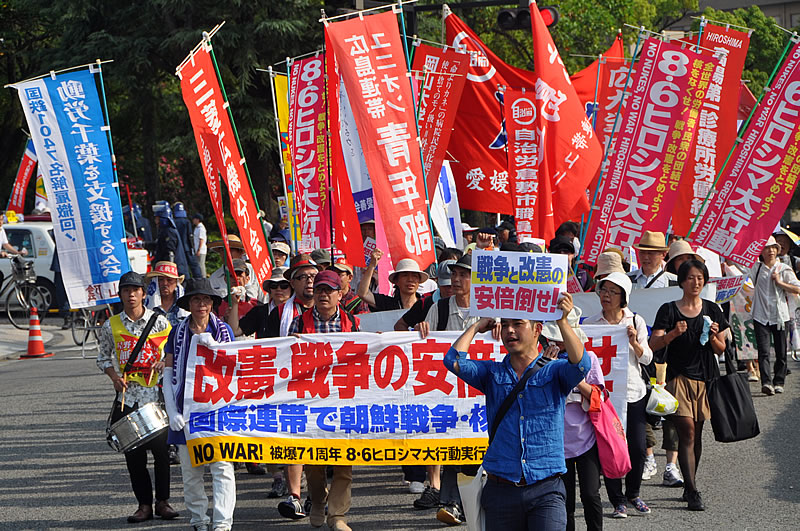 被爆71周年の8・6闘争が、今年一番の酷暑という広島市で、全国から結集した労組交流センターの仲間とともに熱く激しく闘われた。8・6闘争は、原子爆弾という無差別殺戮兵器を生み出し二度も使用した帝国主義と、被爆者・二世・三世を先頭にした労働者階級人民との激しい攻防として一年一年を積み重ねて来た。今年も5月のオバマ米大統領の「歴史的訪問」攻撃との激突を踏まえ、朝鮮・アジア核侵略戦争へと突入しようとする米日帝国主義との、国際的にも極めて重要な闘いとなった。