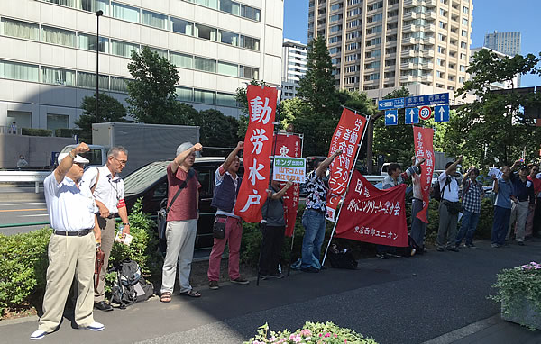 7月29日、14時に青山1丁目にあるホンダ技研本社に対して、社前抗議行動と申し入れを行い、背景資本ホンダ・山下ゴムに会社解散・全員解雇の責任を取らせる闘いに突入した。