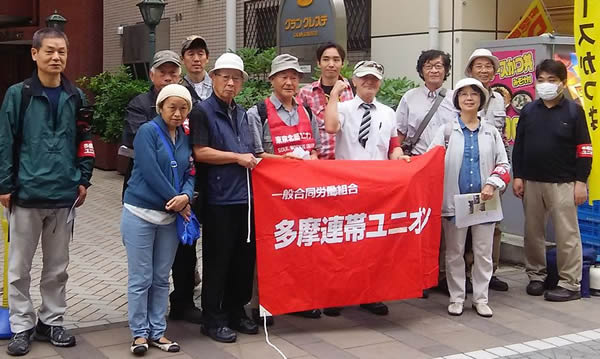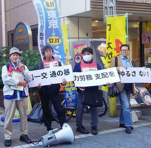 正午から武蔵境駅前で組合のぼり・11月集会のぼりを林立させ、ゼッケンを付けて、マイクでアジテーションし、分会ニュースと11月集会ビラを配布しました。組合への支援・結集を呼びかけ、さらに11月労働者集会・国際共同行動への参加を訴えました。