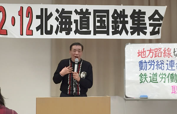 第2部は、元国労札幌闘争団で、現在、動労総連合・北海道(準)代表の長尾信一さんが「JR北海道は、このまま行ったら2019年に安全運行ができなくなると言った。これは鉄道事業者として絶対言うべきことじゃない、赤字だろうと安全は確保しますと言うべき。分割・民営化から30年かけて推し進めてきたことが、この廃線=切り捨て問題だ。彼らはそういう企みを当初から共謀していた。それをいつやるか―今でしょ、と実行している。残念ながらJR北海道の労働組合が物を言えない。国鉄マンの解雇に加担し多数派を取った組合は当時の国鉄当局以上にひどいことをやってきた。国鉄労働者を自殺に追いやった労働組合、そんな組合がものを言えるわけがない。今、ここだけがこういう集会をやっている。今はまだ小さい声でもいずれ必ず大きな声になります」と発言しました。