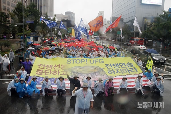 チェジョンジン民主労総委員長職務代行は「北・米間対決が韓半島を崖っぷちに追いやり韓半島戦争説に拡大している。韓半島に再び戦争が起こったならばそれはまさに災難だ。来週からウルチフォーカス韓米軍事訓練が始まったら、今よりもっと深刻な状況に駆け上るだろう。韓米連合軍事訓練中断と北核実験凍結で互いの脅威を減少させて協商が始まってこそ、韓半島非核化も論議することができる。対話が始まってこそ韓半島平和のための平和協定締結論議を始めることができる。我々は戦争に反対して平和を願う」と訴えた。