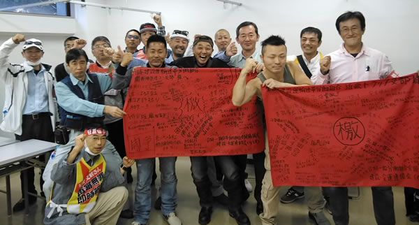 集会当日、我々GTRの仲間が檄布を二枚(関西地区生コン支部と近畿トラック支部MK運輸分会)用意し書き込み、集会参加者にも協力していただき激励の言葉を書き込んでもらいました。集会前には、関西地区生コン支部の大原明執行委員と近畿トラック支部MK運輸分会清水隆圭書記長とGTRを代表し、鈴木コンクリート工業分会と小竹運輸グループ労働組合で初対面で話すことが出来ました。