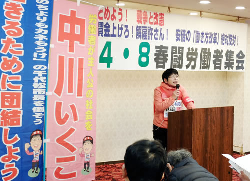 4月8日、泉佐野市内で「とめよう!戦争と改憲 賃金上げろ!解雇許さん!安倍の『働き方改革』絶対反対!4・8春闘労働者集会」が開催されました。泉佐野市で新分会結成をかちとった関西合同労組と、泉州支部を結成した婦人民主クラブ全国協議会を軸に、泉州で階級的労働運動の拠点建設をめざして闘う仲間が集まりました。5月泉佐野市議選に関西合同労組泉州支部書記長・中川いくこさんを押し立てて、泉州労働運動をつくる決意をうち固めました。