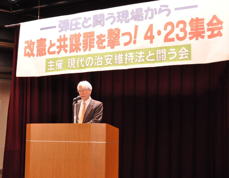 4月23日夜、東京・日比谷図書文化館で、「改憲と共謀罪を撃つ!4・23集会」が開かれました。戦争・改憲と一体の治安弾圧法=共謀罪を粉砕しようと80人が参加しました。主催団体の「現代の治安維持法と闘う会」の山本志都弁護士が報告。「共謀罪は、実行行為が行われていない段階での意志の合致を処罰対象とし、警察による監視、尾行、盗聴などを日常的に横行させる悪法だ」と批判。内田博文・九州大学名誉教授が約1時間の講演を行いました。