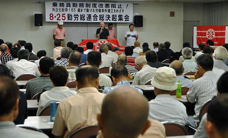 次に津田沼支部の相馬支部長、千葉運転区支部の高澤支部長、木更津支部の花崎支部長が乗務員支部からの決意を表明。そして動労水戸の国分副委員長から、勝田運輸区での指導員不当解雇、10月20日からの特急車掌一人乗務による合理化、水郡線ワンマン化提案に対して職場から闘いぬく決意が表明された。エルダー協議会の越川議長も「65歳まで働ける労働条件を勝ち取るためにも乗務員制度解体攻撃と闘う」と決意を語った。
