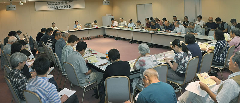 東京の「日の君」被処分者からの発言が続きました。「思想弾圧を許さない」「治安維持法下、共産主義者以外の人が弾圧された。今はそれに近い状況」「一人から二人、三人へ広げよう」「分会員も教組本部も抗議の声をあげなかったのは人事考課制度があるから。人事考課制度をぶっ飛ばし戦争教育阻止へ進もう」「組合教研に現場の組合員が集まらない」「若い教職員は『選挙に行ってもいいの?』というくらい権利も政治も知らない」「この現実から出発しよう。外からの呼びかけも必要」と、いろいろ意見が出されました。非正規教員は起ち上がっている