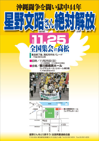 沖縄闘争を闘い、無実で獄中44年の星野文昭さんを取り戻す闘いは、昨年7月に高松市にある四国地方更生保護委員会に対する闘いを開始して以降、もっとも緊迫した状況を迎えています。更生保護委員会は星野さんの「仮釈放審理」を開始、結論を出すための過程に入ったと考えられます。全国再審連絡会議が呼びかける11・25星野全国集会の成功を高松の地でかちとりましょう。