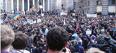 (写真) 4月1日ロンドンで開催されたG 20 サミットに対して数万の労働者のデモが叩きつけれた。デモのコールは「革命!革命!団結すれば負けないんだ!」。世界の労働者の想いはひとつだ!(ロンドンのイギリス中央銀行前を埋め尽す群集)