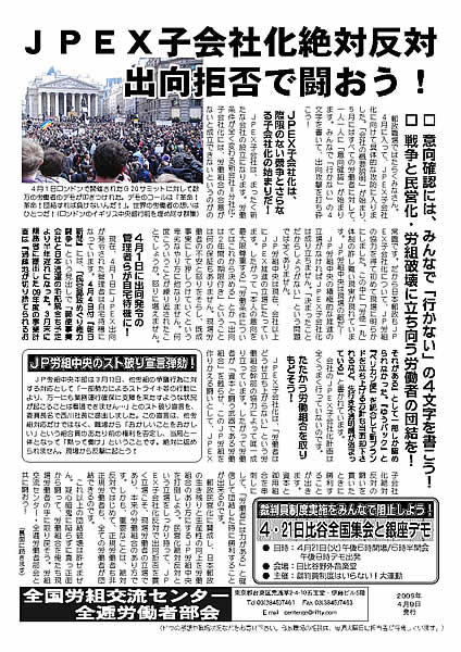JPEX子会社化は、「労働者はどうせ立ち上がらない」という労働組合幹部の協力によって唯一成り立っています。したがって労働者が「資本と闘う武器である労働組合」を甦らせ、このJP労組を作りかえる闘いとして、JPEX子会社化絶対反対の闘いを貫いたときに勝利することが出きます。資本と御用組合を串刺しにして、「労働者には力がある」と確信して団結した時に勝利することが出来るのです。