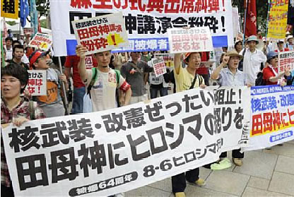 全世界の労働者の団結で核廃絶を! 8・6田母神「核武装」講演会粉砕! 道州制・民営化絶対反対! オバマ幻想ぶっ飛ばし、8・6被爆64周年の広島の街をデモ