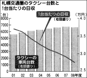 全北海道のタクシー輸送人員は、1970年には2億9530万人でした。それが2001年には1億5515万人になっていました。その時の札幌圏のタクシーの台数は、7300台でした。