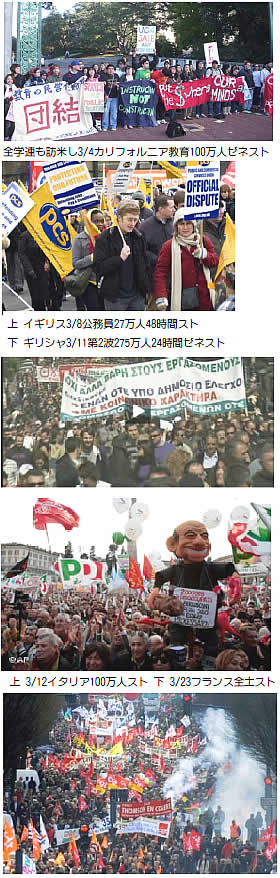 闘争スローガンはすべて同じ。各国政府の財政危機を理由とする公務員首切り、民営化と賃下げ、年金受給年齢引き上げ・年金カット、社会保障解体と大増税に対する絶対反対の怒りの爆発です。金融独占資本救済のために使い尽した国家財政の危機を、労働者に押しつけるな!