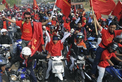 (写真 インドネシアの労働者は、賃上げ、派遣労働禁止などを求め、280万人がゼネストに決起した【10月3日 西ジャワ州】)